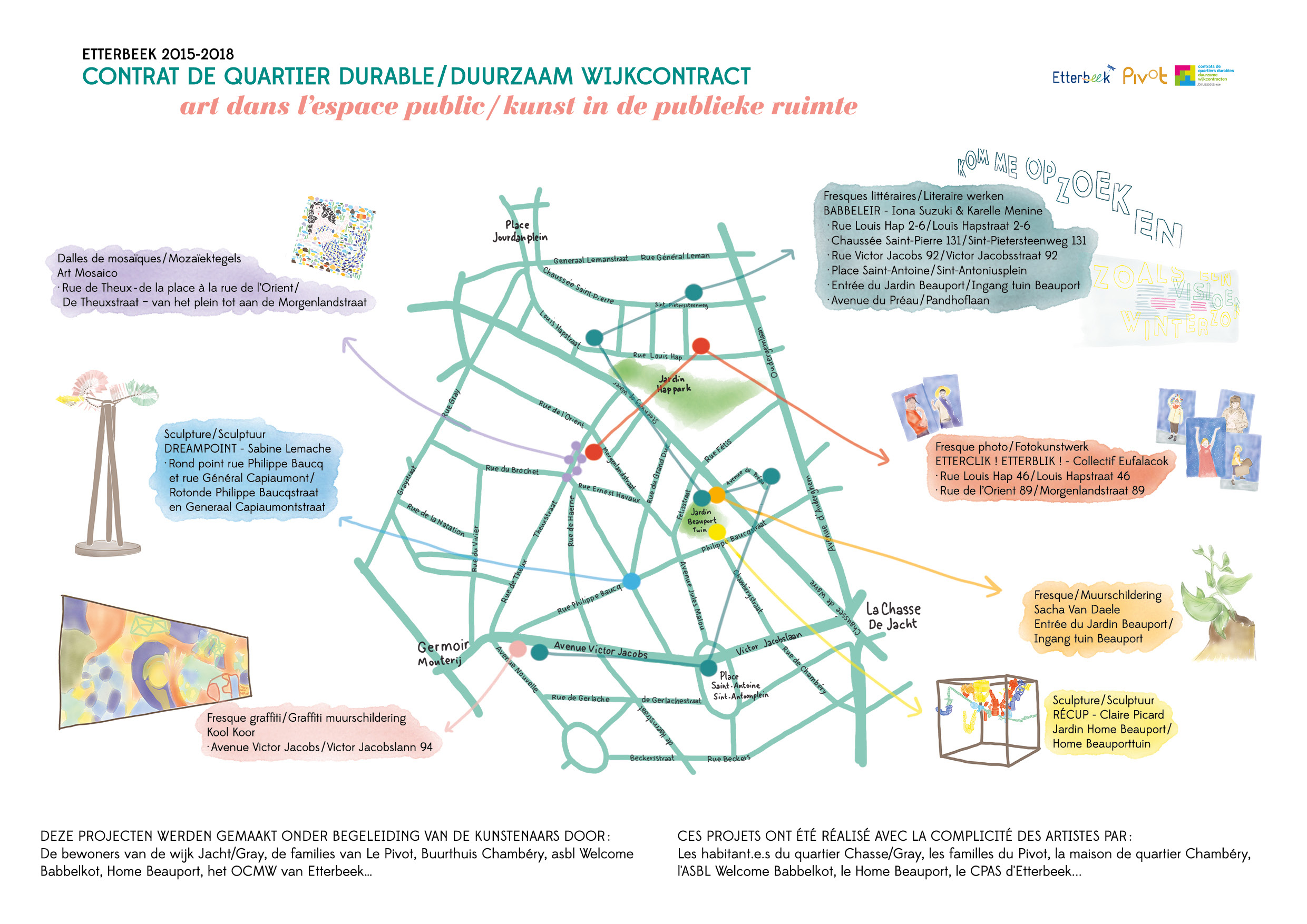 Carte illustrée pour le parcours artistique du Contrat de quartier durable d’Etterbeek, Belgique.